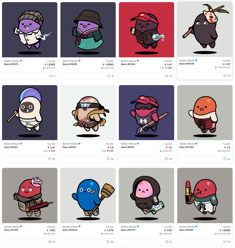 Another Chiru Labs creation, Beanz is a 20,000-piece collection of digital art that depicts small, bean-like characters that serve as sidekicks to Azuki characters. Each contains a set of unique features, spanning background color, clothing, eyes, face, headgear, shoe and type. For example, red “Toshi” types are known for their rebellious nature, according to online publication Beanztalk.io.