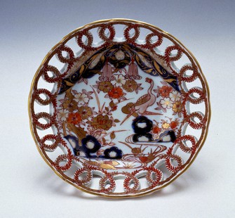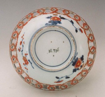 Sakuraba surveyed 24 institutions in Japan that held Imari ware, and found there were at least eight pieces at four institutions, including four at the Kyushu Ceramic Museum and two at the Idemitsu Museum of Arts in Tokyo. Two bowls, held respectively at the Kyushu Ceramic Museum and the Imari Nabeshima Gallery bear the same title: “Iroe tori maku sakura botan mon wa-tsunagi sukashi-zara” (Openwork connected-ring dish with colored picture, bird, curtain, cherry blossom and peony design). The pieces bear the mark “N:316+” with “N:” meaning “No.” and the cross being the symbol that was used by the palace to denote Japanese porcelain.