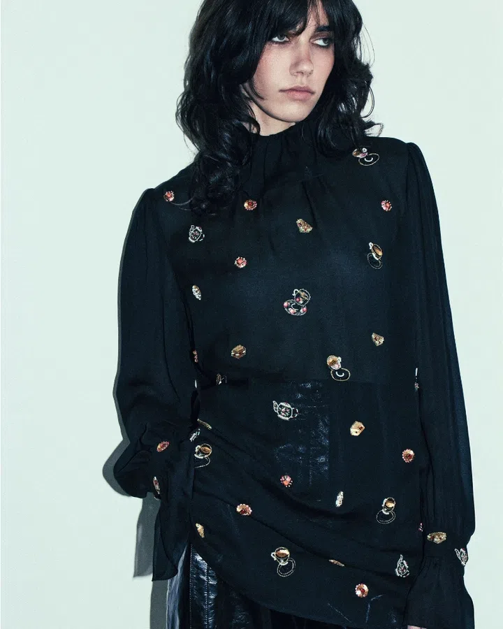 At Lesage’s workspace, the walls are lined with floor to ceiling boxes that keep the Maison’s precious archives. The history of fashion as told in swatches of embroidered fabric, all in one room. Continuing this narrative, you see the artisans working, handling the needle and thread with expert precision, creating the details that will make the next collection unique. “For the Chanel Métiers d’art Manchester collection, it started by knowing Virginie’s vision, what she wanted to express,” Barrèrre shares. “For Manchester, we asked what it evokes, and it was a ping-pong of ideas between Virginie and what I proposed. Then we develop the idea together, I go to the atelier and work with the embroiderer for us to propose samples that will nourish the creations of Virginie through what we create at Lesage. It is a lot of work, we have 10 collections per year and only 10 days to create for each collection.”