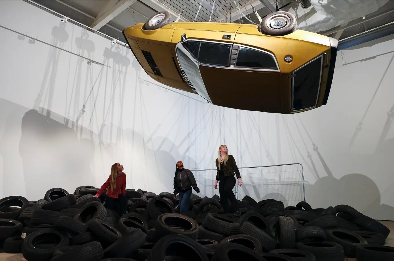 Almost as breathtaking as Wilson’s 20:50 is the brilliant pairing of Conrad Shawcross’s suspended car sculpture with Allan Kaprow’s interactive installation YARD. Originally commissioned for the Saatchi group show Sweet Harmony: Rave Today (also curated by Adams), Shawcross’s kinetic sculpture Golden Lotus (Inverted) dangles above viewers, rotating gracefully yet unnervingly. Beneath it lies Kaprow’s mound of tyres, an installation visitors may clamber across in a playful interaction with art.
