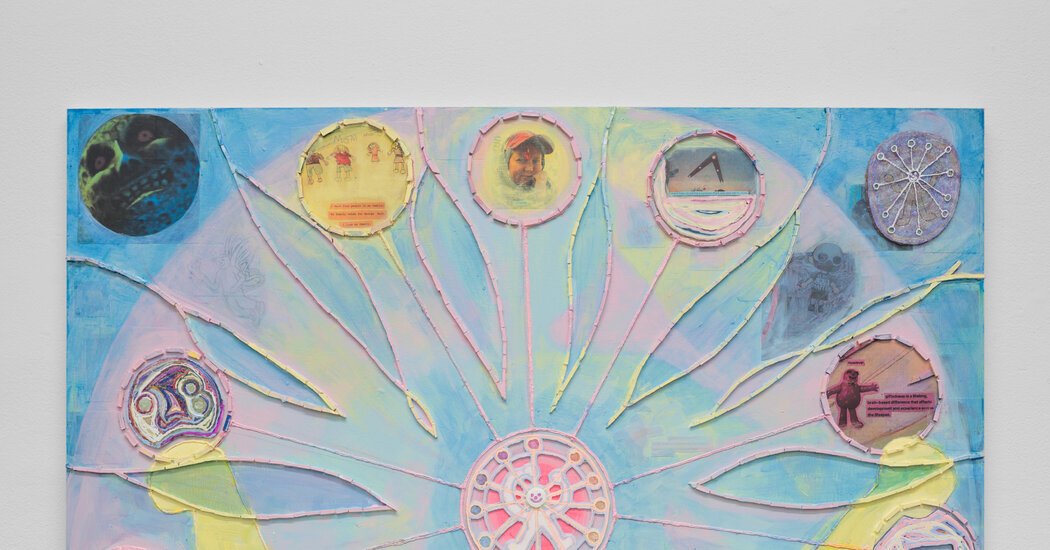 When you step back and take them in whole, they suggest cosmic diagrams or the creations of an obsessive teenager. When you get up close, any overarching imagery dissolves into snippets of Google search results, memes and personal photos embedded into the surface.