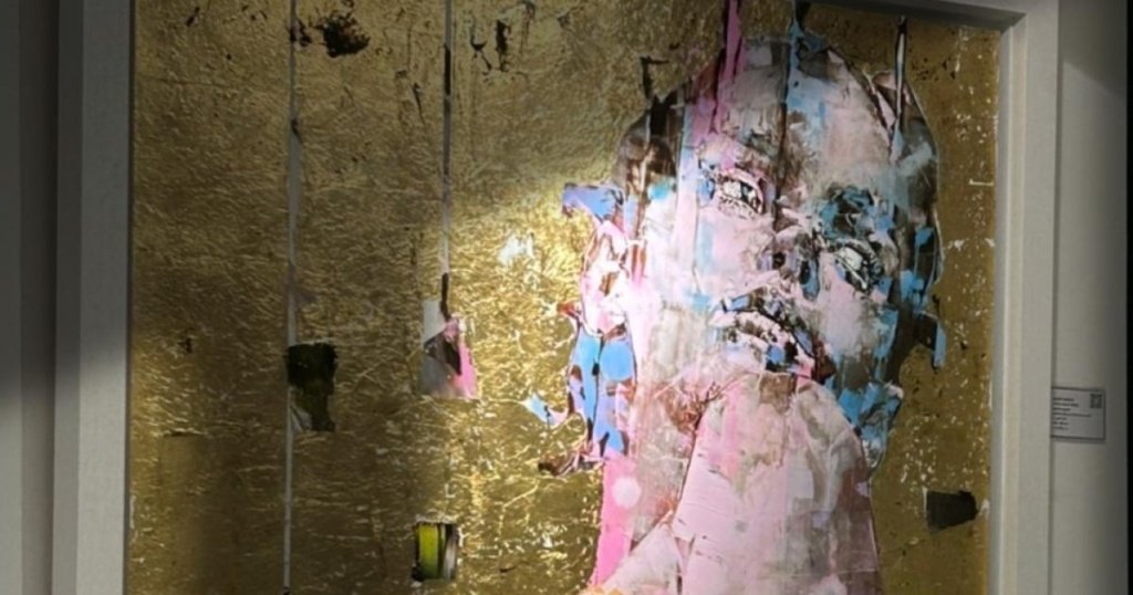 His paintings often depict female figures against luminous gold or metallic backgrounds, evoking both contemporary and classical iconography.