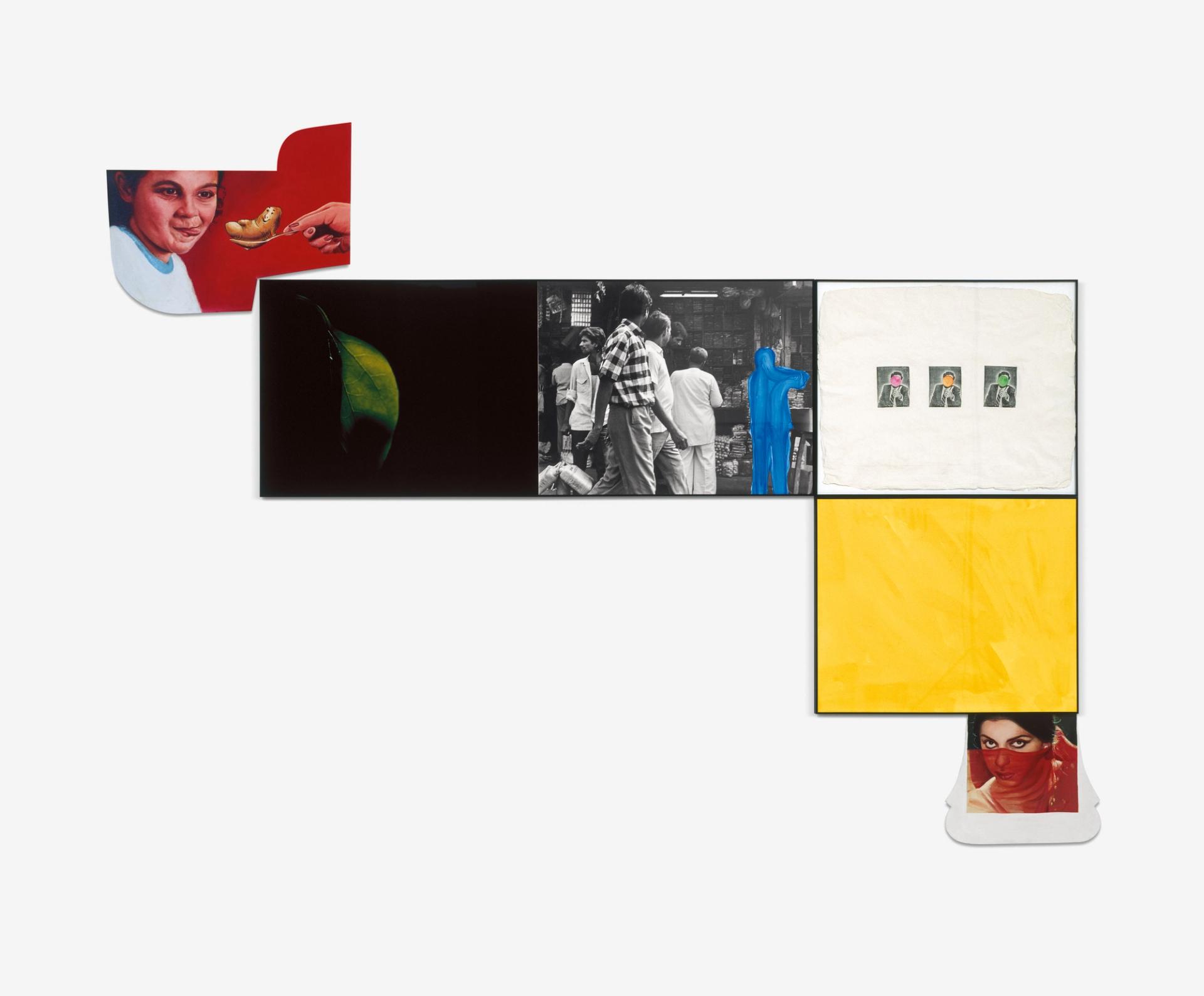In 1992, John Baldessari took up residence at the Villa Sarabhai in Ahmedabad, the Tropical Modernist brick and concrete house designed by Le Corbusier in the 1950s. There, thanks to the visionary patronage of the Sarabhai family, the California conceptualist produced a series of mixed-media assemblages which reflected on the copious visual stimuli that surrounded him in the western Indian city. In some ways, it is his most important documentary series, with photographs taken as he made his way around the metropolis and found or adapted objects inspired by the materiality of everyday Ahmedabadi life, including paintings on rubber responding to the rickshaw mud flaps decorated by local sign painters.