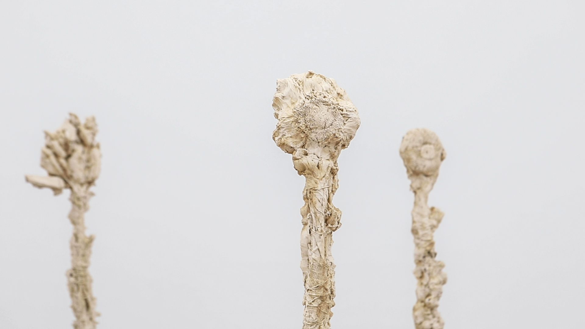 The significance of Jodie Carey’s title for her installation at Edel Assanti is clear immediately as you confront it: a gathering of tall sentinel-like sculptures based on flowers that have been transformed through a complex sculptural process. The forms are made using earth-casting: Carey wraps plants with cloth and thread before pressing the sculptures into soil to form a mould, into which she pours jesmonite. Like much of Carey’s work, the sculptures at once encapsulate that technique but exude an almost spectral strangeness. They also challenge the monumental history of sculpture, particularly in reference to flowers’ commemorative or nationalistic symbolism; it is no accident that Carey’s sentinels also evoke shrouded or etiolated bodies.