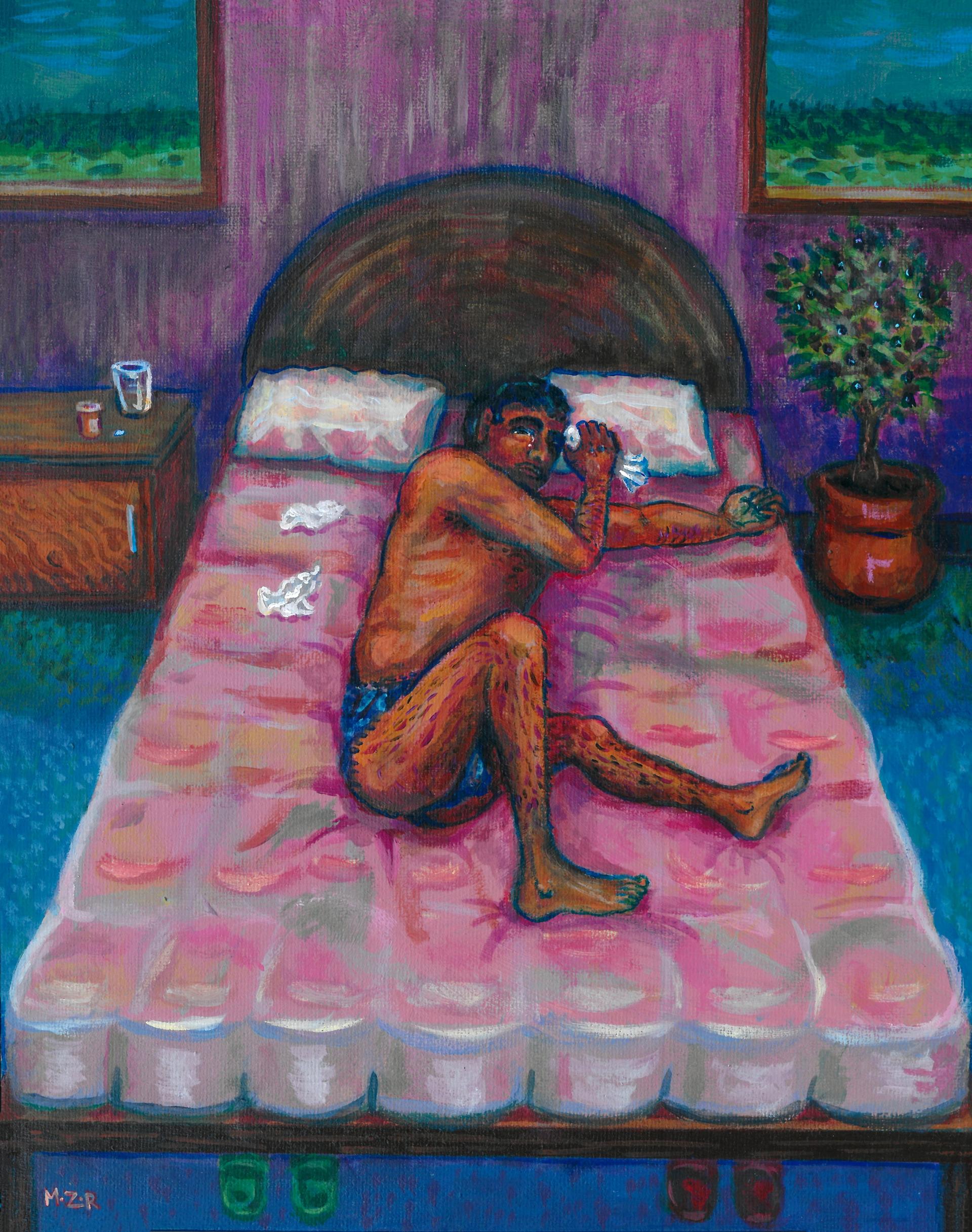 London born and based, Mohammed Z Rahman has a distinctive narrative figurative painting style with which they allude to personal and cultural memory and history while looking back to both Western and non-Western art historical periods. Spaghetti House is their largest painting to date; reflecting both a playful moment of imagination with their niece—in picturing the pasta abode of the title—and a paean to childhood innocence amid current and ongoing socio-political contexts. It draws on the continuous narratives and domestic scenes in Mughal and Flemish painting. Also here are Festivals, stage-set panels depicting communal scenes drawing on Rahman’s own experiences, including Diwali celebrations and a patio barbeque.