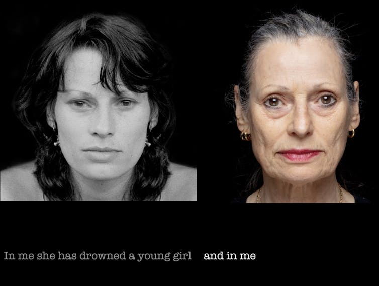 In Mirror Talk, we see the faces of young Julie and older Julie glitching and morphing. We can hear a typewriter beat out the words from Sylvia Plath’s poem Mirror – becoming a language for young Julie, aged 31, to talk to her future self, aged 72. This poetic device issues an affecting tenderness from the present self to the past self and vice versa.
