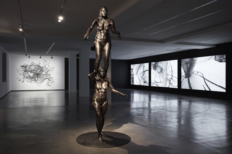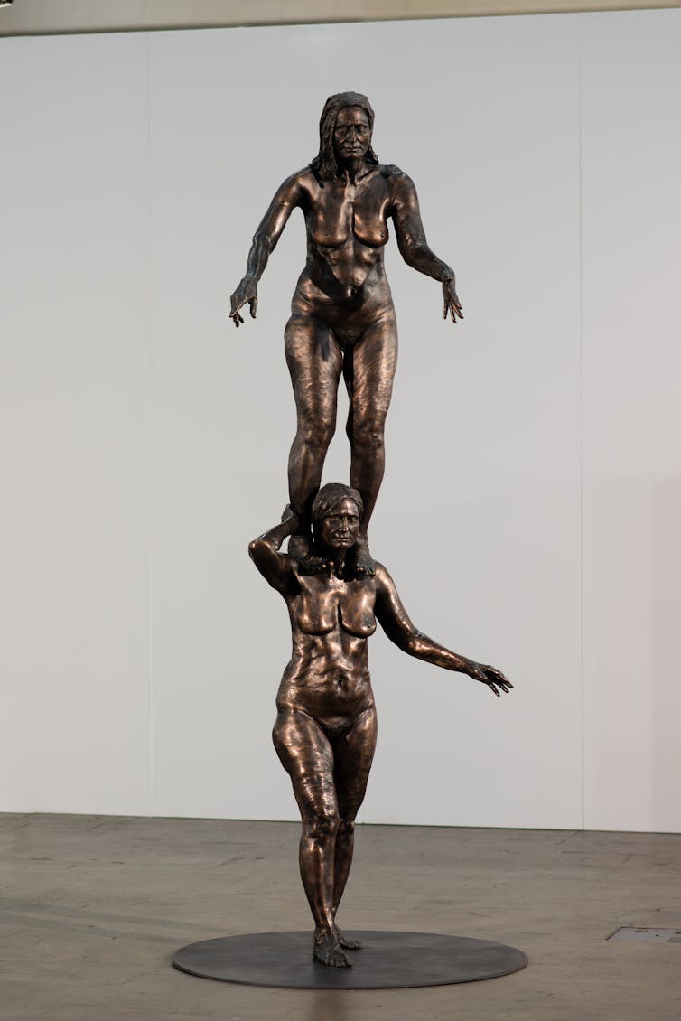 At the centre of the exhibition is SOMOS (Standing On My Own Shoulders) (2023), a life-sized bronze sculpture of Rrap standing on her own shoulders. To see the body of a woman in her seventies cast in bronze is gloriously defiant and daringly unconventional.