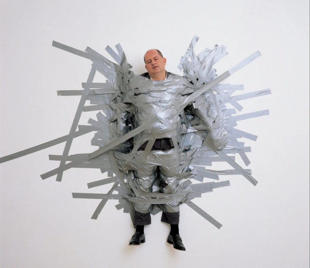 A photo of Massimo De Carlo wrapped in duct tape on a pristine white gallery wall captures the performative, absurd, and slightly cruel edge of A Perfect Day.A photo of Massimo De Carlo wrapped in duct tape on a pristine white gallery wall captures the performative, absurd, and slightly cruel edge of A Perfect Day.