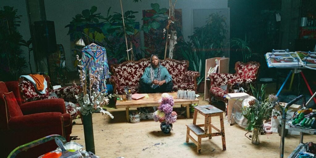 Christina Quarles, her wife, producer and screenwriter Alyssa Polk, and their daughter lost everything in the Altadena fire in L.A. last January. The devastation delayed but did not derail her practice, which merges the technical with the spiritual. Quarles’s paintings feature figures bent and contorted to fit into dynamic, futuristic spaces; they twist and collapse into one another, revealing fluid, layered textures that carry the weight of history and memory.