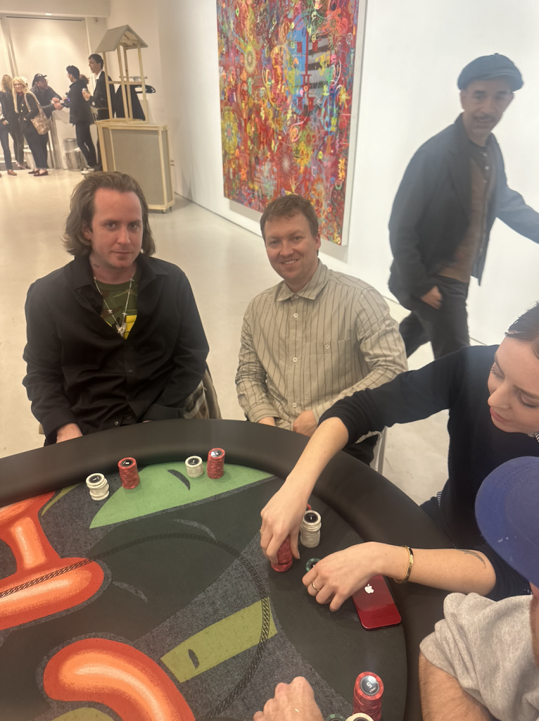 The poker evening was organized by Jason Roussos, a collector who runs the clothing/gambling-events company Casinola, which has been staging a string of recent DIY tournaments in Los Angeles. “Gallerists and collectors are both risk-takers when it comes to finances, which is cohesive to the game of poker.” Roussos told me. “And artists really enjoy it because it’s a game that allows you to be creative, while taking risks.”