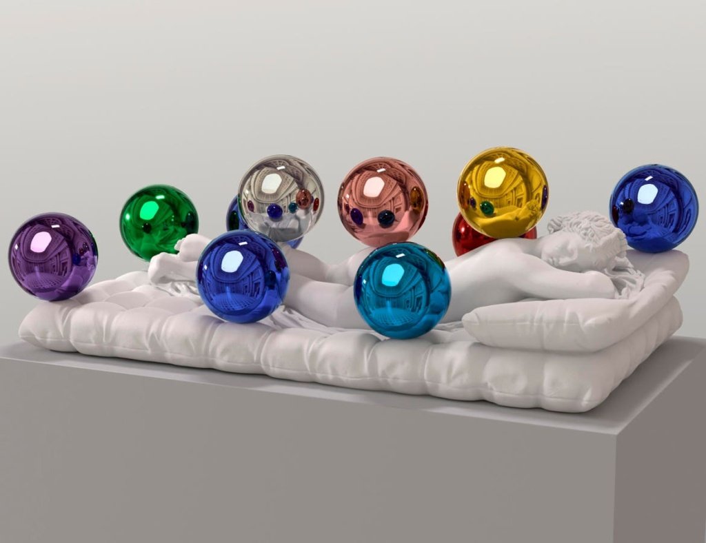 Jeff Koons, (Sleeping Hermaphrodite) Gazing Balls, 2025. Plaster and glass, 60.6 x 179.5 x 100.3 cm. Edition 1 of an edition of 3 plus 1 AP. © Jeff Koons.