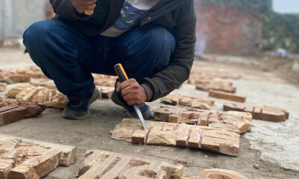 Umesh S. is similarly engaged with themes of abandonment and retrieval. Recognising the plight of India’s agrarian communities, who face persistent threats to their livelihoods and a daily fight for recognition, Umesh has been preserving the wisdom and culture of his ancestral village in Bihar. His sculptural installation is a composition of poetic verses carved onto panels of waste wood and implements cast aside by those no longer able to farm. The words, written in Bhojpuri, a language spoken in parts of northern India, are, Umesh says, “the words that once echoed through fields and hearts, carrying the essence of a way of life deeply intertwined with nature.”