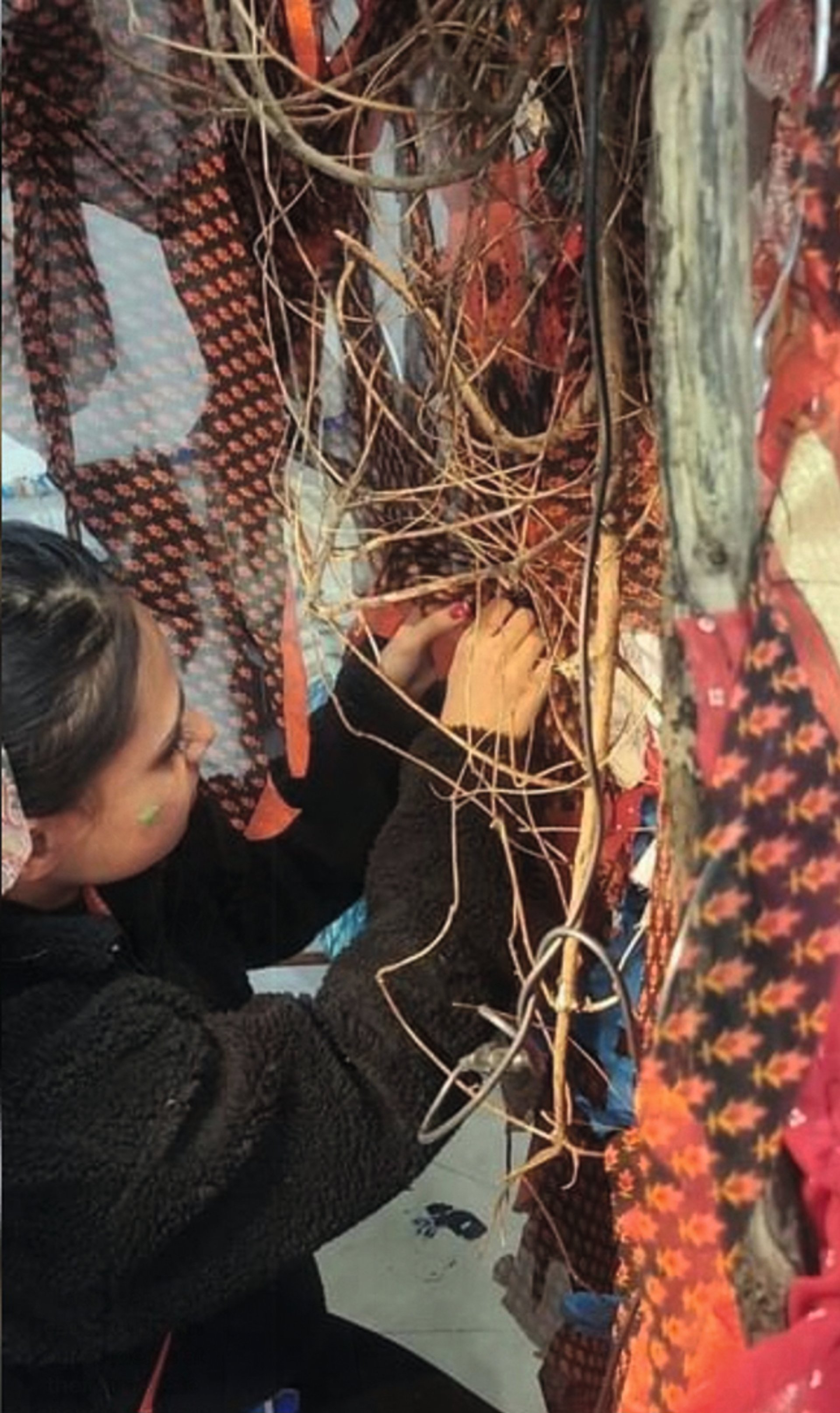 Imon Chetia Phukan works on her suspended fabric forest, a nod to her homeland in Assam Courtesy the artist