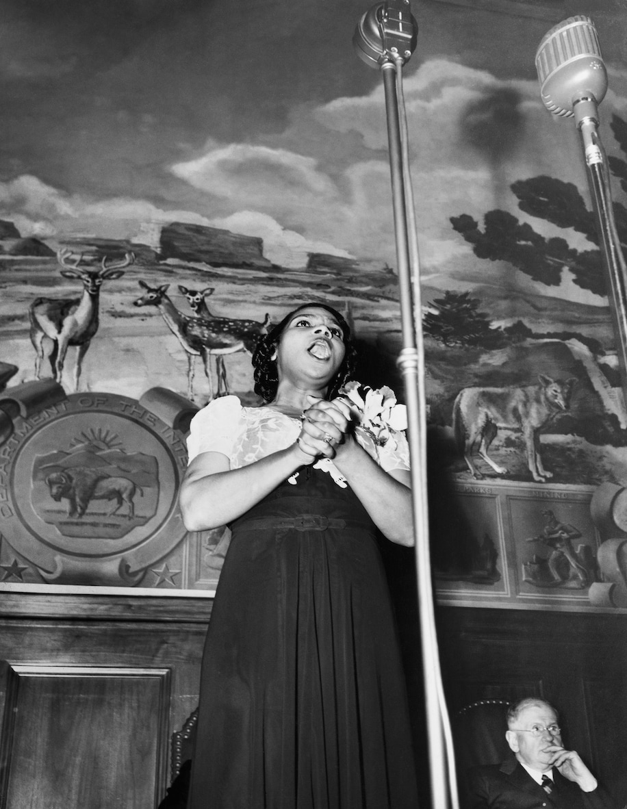 GORDON PARKS, “Marian Anderson broadcasting a Negro spiritual at the dedication of a mural installed in U.S. Department of the Interior building, commemorating the outdoor concert she gave at the Lincoln Memorial after the Daughters of the American Revolution refused to allow her to sing in Constitution Hall,” Washington, D.C., 1943. | © Gordon Parks/Gordon Parks Foundation