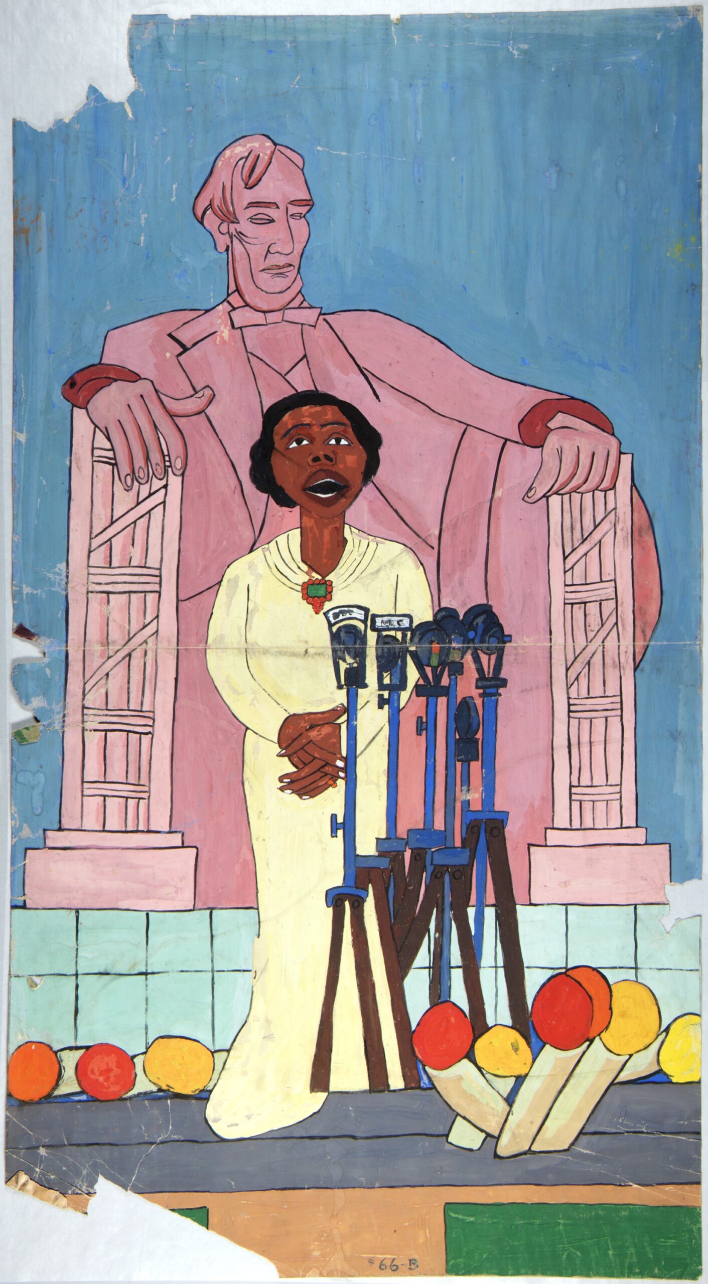 Portraits of Anderson are currently featured in major museum exhibitions. “Marian Anderson,” a circa 1945 painting by Johnson envisions the singer as a world renowned performer. She is at the center of the composition surrounded by smaller symbolic images representing her many tour destinations—a host of international flags, many from South America; St. Basil’s Cathedral in Moscow; and European landmarks, including the Eiffel Tower in Paris. The painting is included in the traveling exhibition “Fighters for Freedom: William H. Johnson Picturing Justice” at the Smithsonian American Art Museum in Washington, D.C.