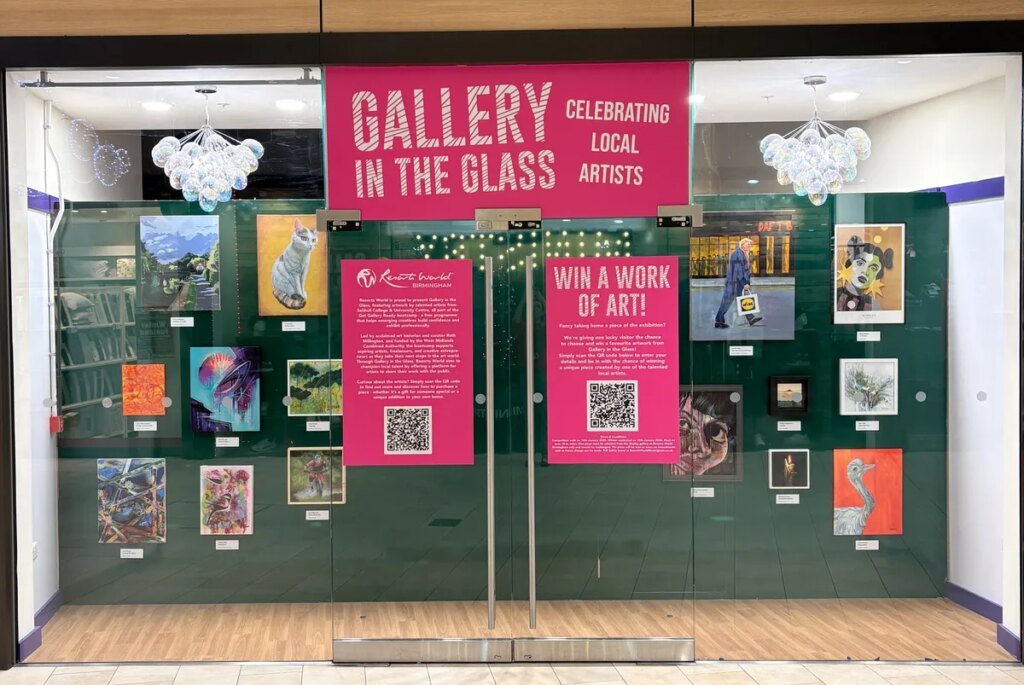 Gallery in the Glass is a community-focused project giving students from Solihull College’s ’Get Gallery Ready’ bootcamp a high-profile platform to exhibit their work right beside leading retail brands.