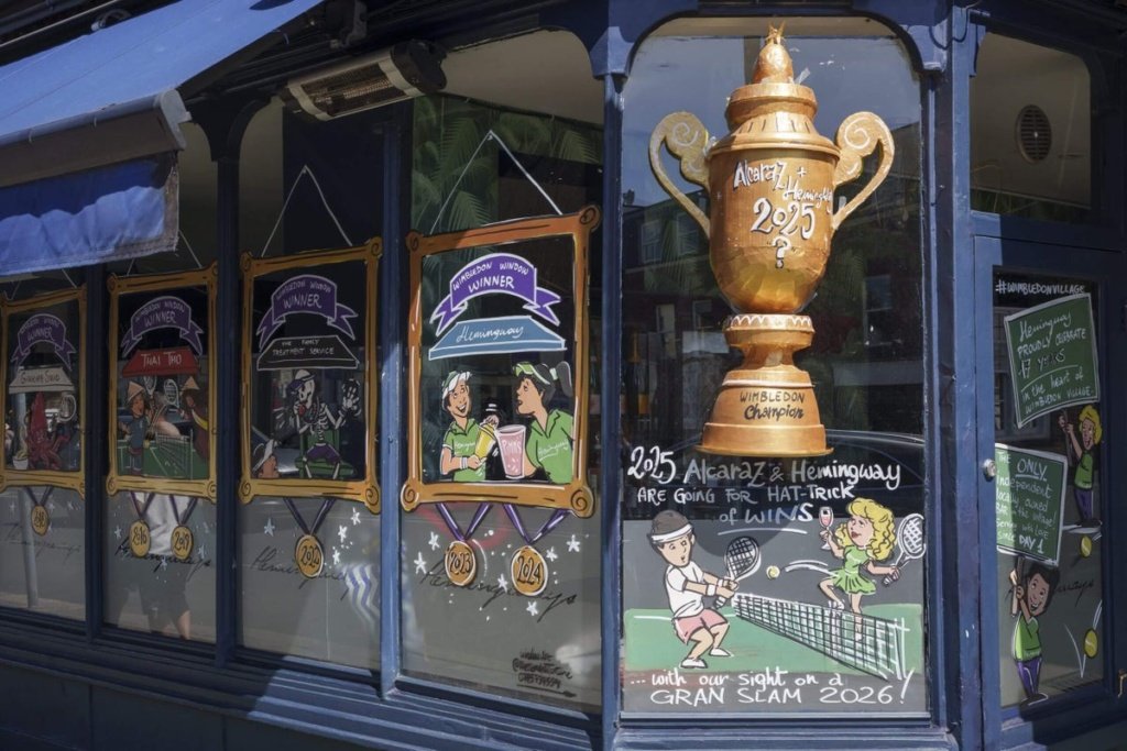 If they aren’t doing it themselves, the participants, who are mostly members of the Wimbledon Village Business Association, employ artists to paint or draw something colorful and tennis-themed on their window fronts. But once the competition is over, to the shops go the spoils.