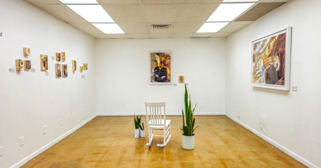 Sit in the chair and pet the giant snake plant while you browse the art on the wall. Relax and imagine yourself melting into the air and vibrating with invisible molecules, like how the figures in the paintings melt into the background, brushed with earth tones.