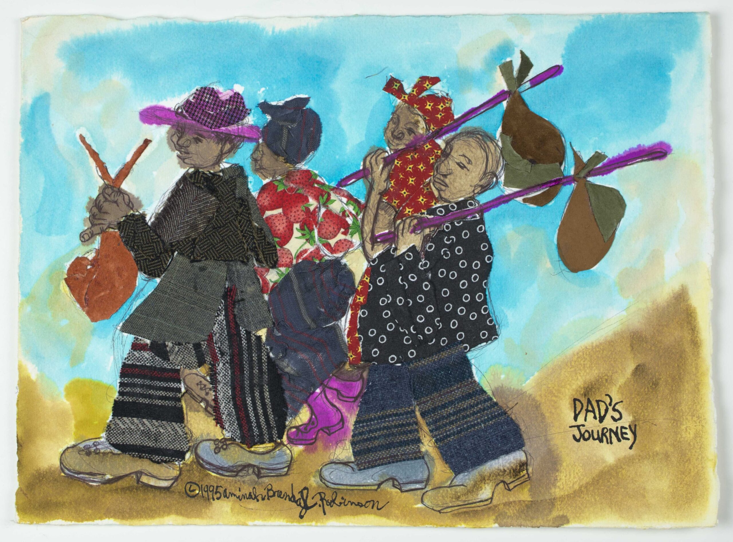 AMINAH BRENDA LYNN ROBINSON, “Dad’s Journey,” 1995 (watercolor, graphite, pen, ink, and fabric, on watercolor paper, 11 x 15 inches). | © Aminah Brenda Lynn Robinson Trust. Courtesy of the Aminah Brenda Lynn Robinson Trust, Columbus Museum of Art, and Fort Gansevoort, New York