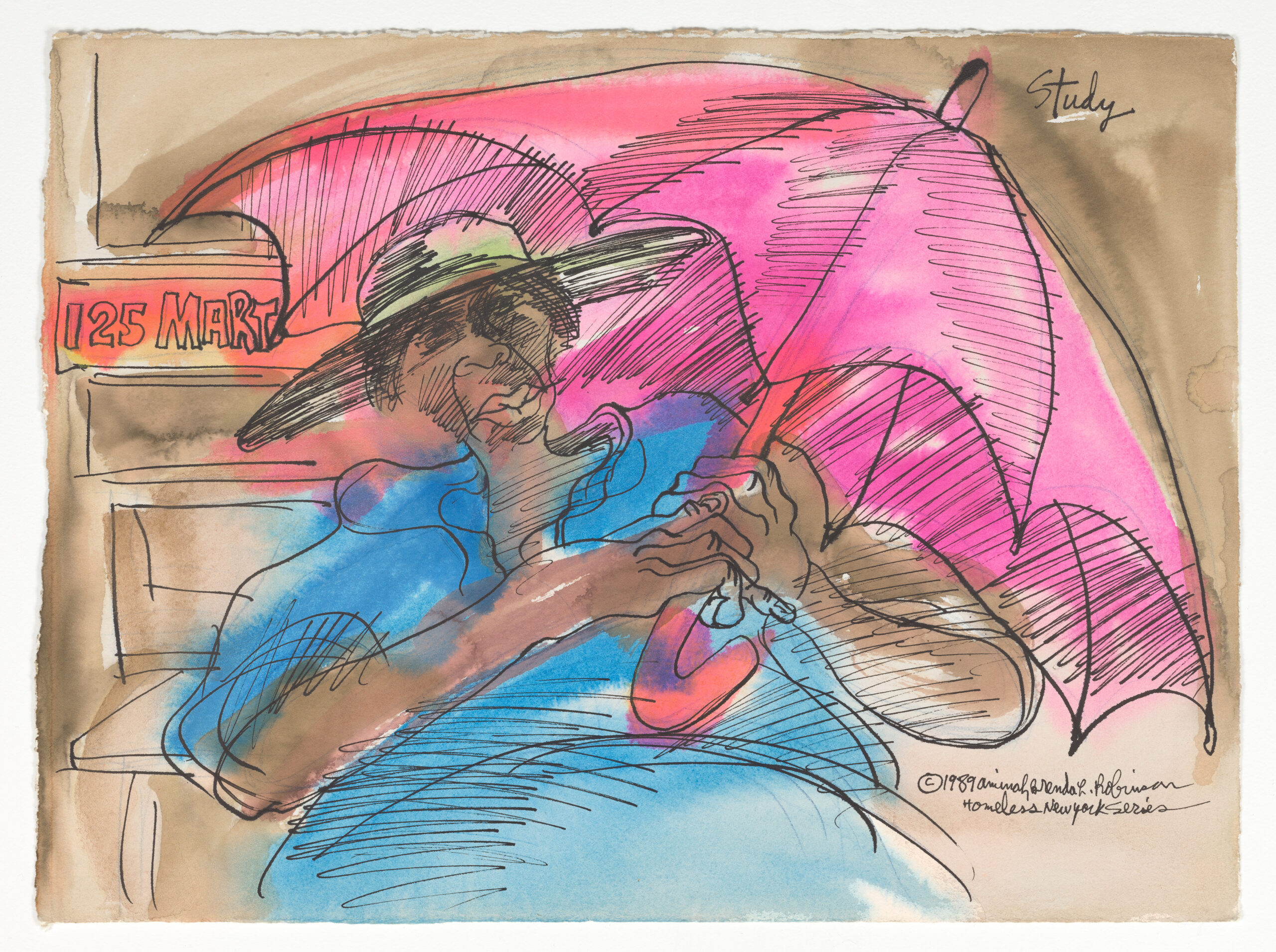 AMINAH BRENDA LYNN ROBINSON, “125 Mart (Harlem),” 1989 (watercolor, pen, and ink, on paper, 11.25 x 15 inches). | © Aminah Brenda Lynn Robinson Trust. Courtesy of the Aminah Brenda Lynn Robinson Trust, Columbus Museum of Art, and Fort Gansevoort, New York