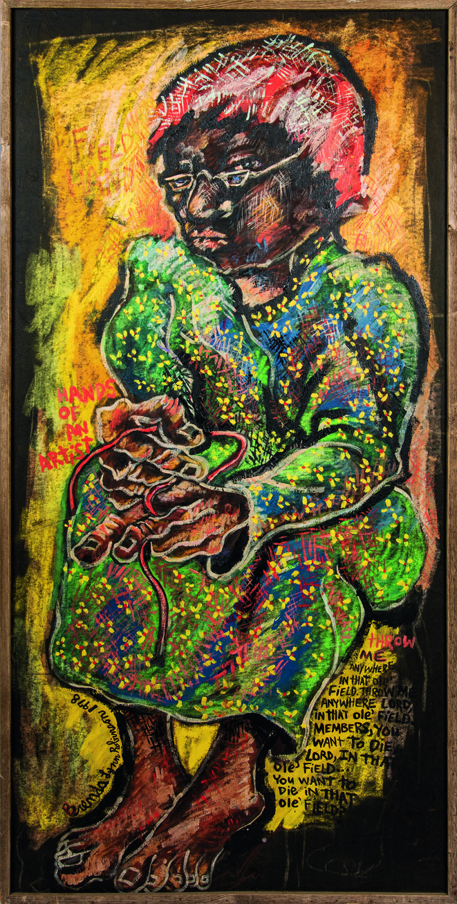 AMINAH BRENDA LYNN ROBINSON, “Field Hand—Hands of an Artist,” 1978 (pastel and acrylic on Pellon, 72.5 x 35.5 inches). | © Aminah Brenda Lynn Robinson Trust. Courtesy of the Aminah Brenda Lynn Robinson Trust, Columbus Museum of Art, and Fort Gansevoort, New York