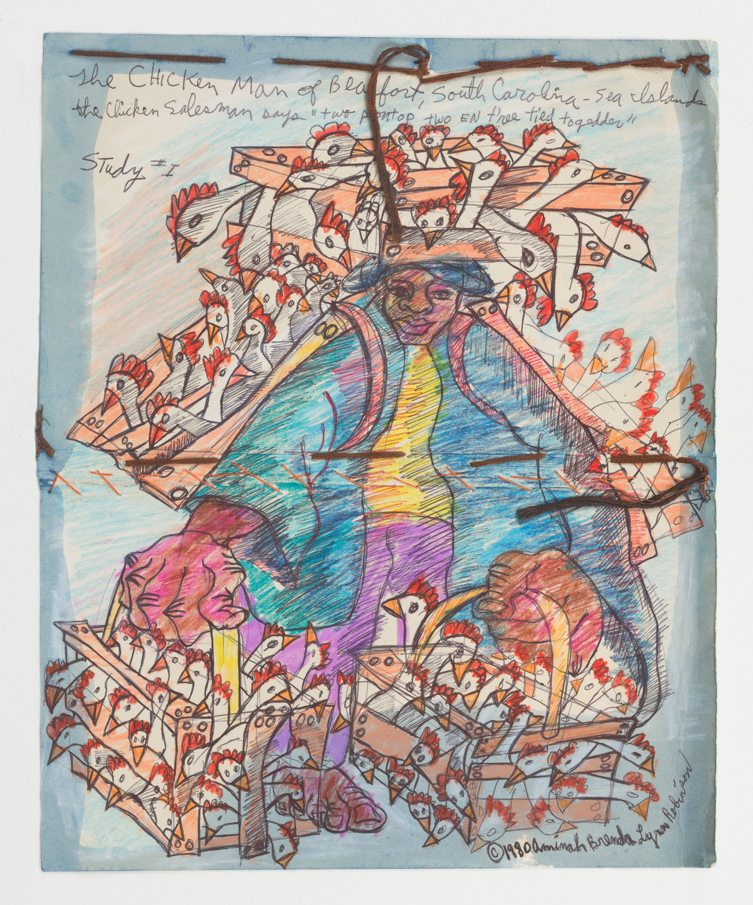 AMINAH BRENDA LYNN ROBINSON, “The Chicken Man of Beaufort, South Carolina,” 1980 (ink, pastel, and thread, on paper, 11.25 x 9.25 inches). | © Aminah Brenda Lynn Robinson Trust. Courtesy of the Aminah Brenda Lynn Robinson Trust, Columbus Museum of Art, and Fort Gansevoort, New York